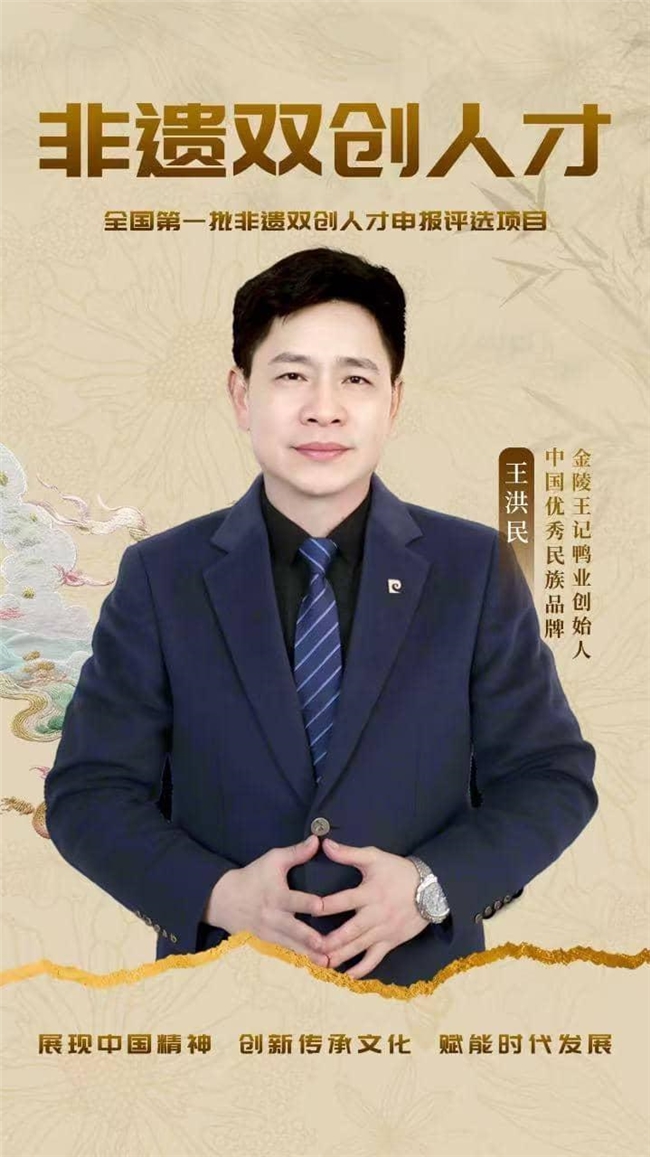 王洪民自幼便与鸭子美食结下了不解之缘,他的家族世代传承着制作鸭子美食的精湛技艺.在继承家族传统的基础上,王洪民不断创新和发展,最终创立了南京金陵王记鸭业,他凭借对鸭类美食的执着热爱和对品质的极致追求,将金陵王记鸭业打造成为了南京乃至全国知名的鸭系列美食品牌.王洪民在致力于企业发展的同时,还积极履行社会责任,参与公益事业。他通过推广健康美食文化、带动当地经济发展等方式,为社会的繁荣和进步做出了积极贡献。